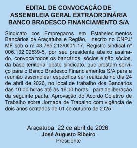 Início/Notícias/Assembleias/EDITAL DE CONVOCAÇÃO DE ASSEMBLEIA GERAL EXTRAORDINÁRIA BANCO BRADESCO FINANCIAMENTO S/A AssembleiasBanco Bradesco S/A EDITAL DE CONVOCAÇÃO DE ASSEMBLEIA GERAL EXTRAORDINÁRIA BANCO BRADESCO FINANCIAMENTO S/A 11 horas atrás 11 horas atrás Mostrar mais Compartilhar Facebook Twitter Linkedin Tumblr Pinterest Reddit Skype WhatsApp Telegram Compartilhar via e-mail Imprimir